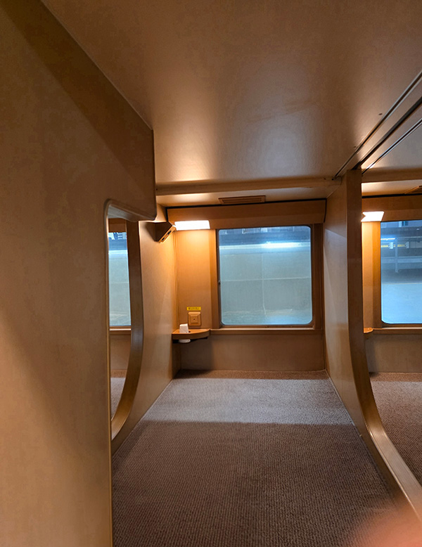これまで夜間の移動手段はバスしかなかったため、どんな状態でも寝姿勢で搬送されるのはとてもありがたいです。入眠の助けになればと、夜食のおにぎりの他にキャップ付きの小さな日本酒のボトルも購入し、いざ寝台車へ。